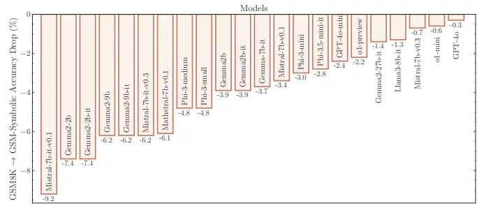 - 无关信息的影响:研究人员进一步创建了 GSM-NoOp 数据集,通过在问题中添加无关的细节来测试模型。结果显示,这些无关信息导致了“灾难性的性能下降”,准确率下降从 17.5% 到 65.7% 不等。
