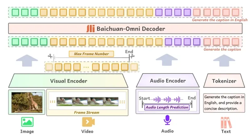 Baichuan-Omni的工作原理可以分成几个阶段。首先,它通过多模态预训练来学习如何处理不同类型的数据。然后,通过多任务微调来进一步提高其在特定任务上的表现。在处理数据时,模型会使用特定的编码器来提取图像、视频和音频的特征,并将这些特征转换成模型能够理解的格式。最后,模型会结合这些特征和文本信息来生成响应或者完成特定的任务。