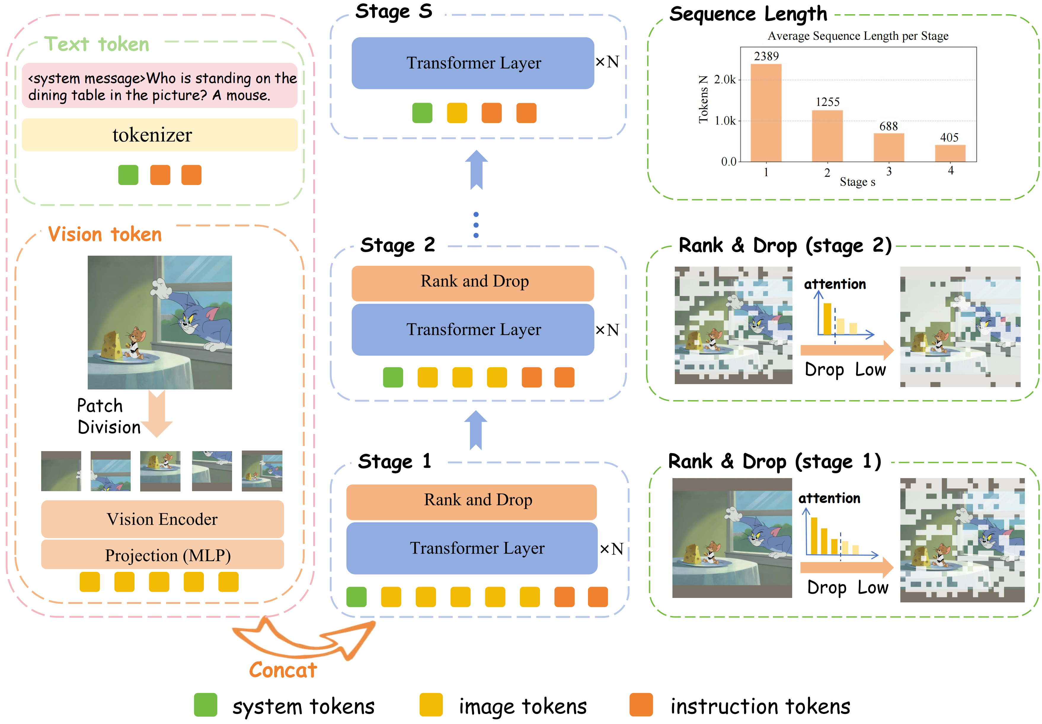 - 保留关键信息:在电脑的“早期阶段”,它会保留所有的视觉令牌,因为这些信息都很重要。随着阶段的深入,它会逐渐扔掉那些变得不那么重要的视觉令牌。