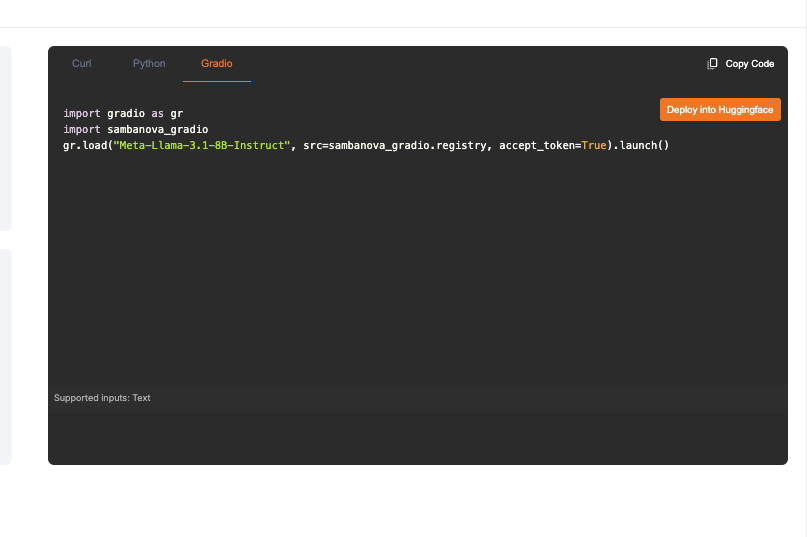 gr.load("Meta-Llama-3.1-70B-Instruct-8k", src=sambanova_gradio.registry, accept_token=True).launch()一键部署:点击“部署到Hugging Face”并输入SambaNova令牌。几秒钟内,一个功能齐全的AI聊天机器人就会在Hugging Face的Spaces平台上可用。
