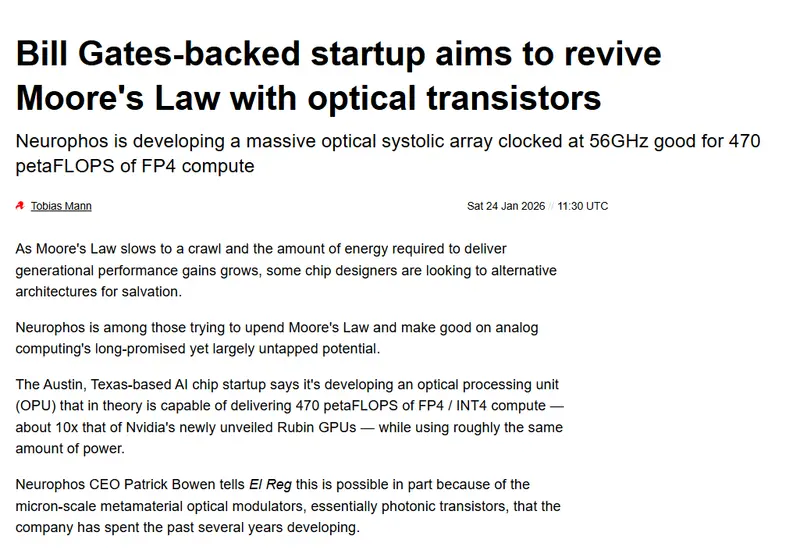 该公司由比尔·盖茨旗下的 Gates Frontier Fund 投资,目标是突破当前硅基 AI 芯片在能效与计算密度上的物理瓶颈。
