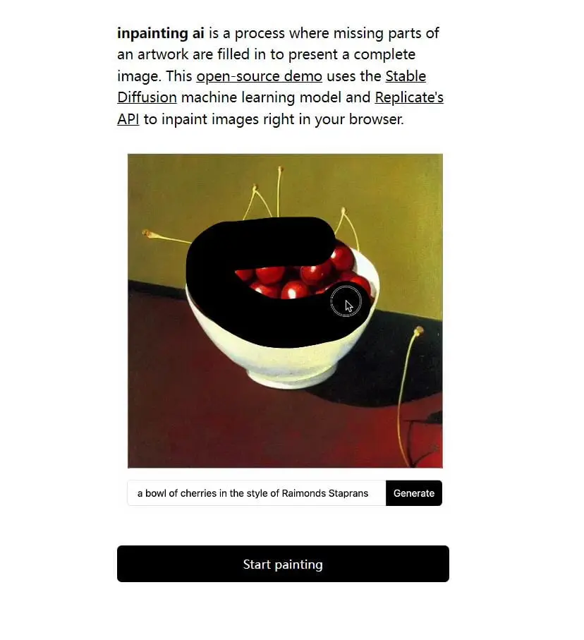 inpainting ai 是一个填充艺术品缺失部分以呈现完整图像的 AI 绘画网站。该开源演示使用 Stable Diffusion 机器学习模型和 Replicate 的 API 直接在浏览器中修复图像。