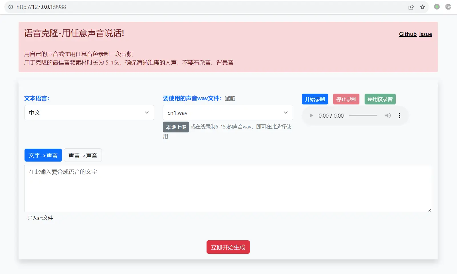 基于 coqui-tts 带 web 界面的声音克隆工具,使用你的音色或任意声音来录制音频,可使用任何人类音色,将一段文字合成为使用该音色说话的声音,或者将一个声音使用该音色转换为另一个声音。