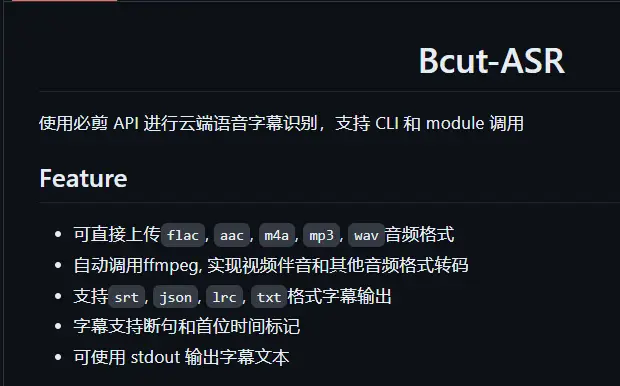 Bcut-ASR 是一款使用必剪 API 进行云端语音字幕识别的开源应用,支持 CLI 和 module 调用。