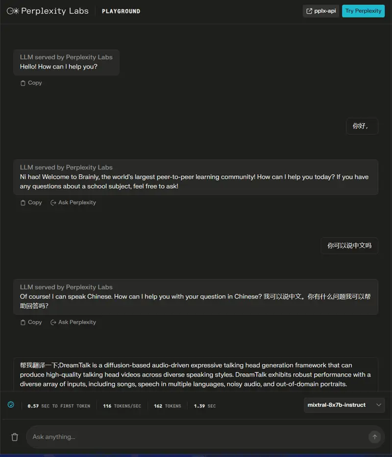 Perplexity AI 是一个结合了搜寻引擎与 ChatGPT 功能的工具,它可以在 AI 问答时瞬间分析即时网络资讯,节省你大量搜寻与整理的时间。目前 Perplexity AI 也在开发自己的大语言模型,目前已经公布了 pplx-7b-online 和 pplx-70b-online,目前已经释出了 Demo,大家可以免费使用。