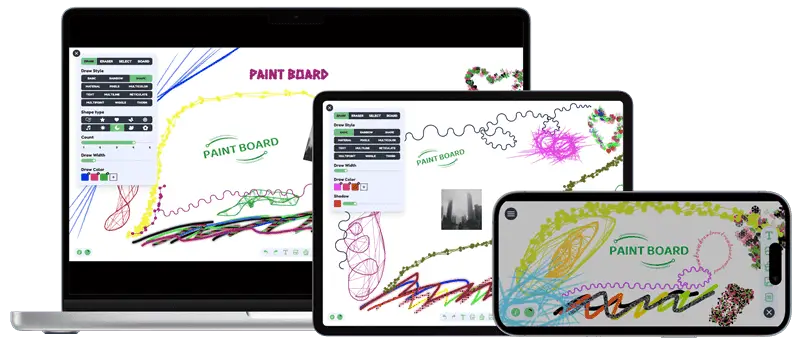- 提供了 12 种不同风格的画笔,包括基本画笔,彩虹画笔,多形状画笔,多素材画笔,像素画笔,多色画笔,文字画笔,多线连接画笔,网状画笔,多点连接画笔,波浪曲线画笔,荆棘画笔。以满足多样化的绘画需求。