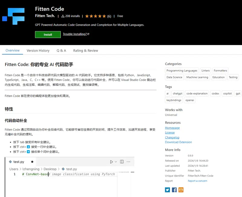 VSCode 插件地址:https://marketplace.visualstudio.com/items?itemName=FittenTech.Fitten-Code