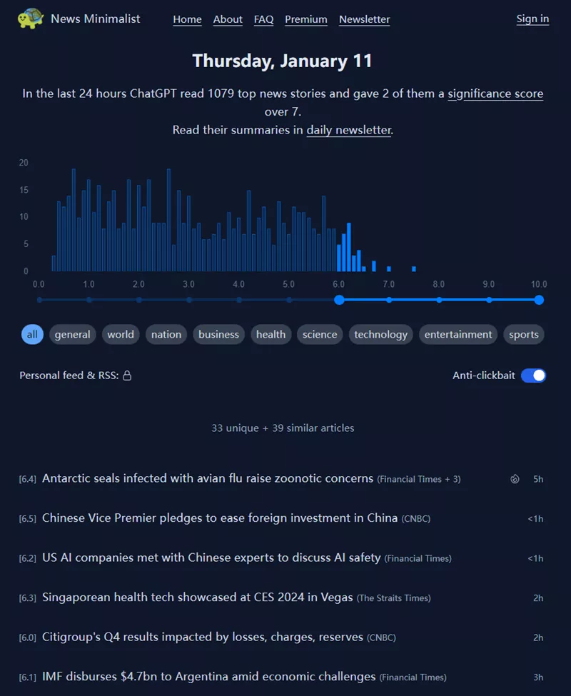 「News Minimalist」是一个以 AI 驱动的新闻聚合器,基于 ChatGPT(GPT-4)每天阅读前 1000 条新闻报导,并按照重要性从 0 到 10 进行排名,同时列出新闻标题和简短摘要,这样用户就不用把时间浪费在筛选垃圾新闻或搜寻重要新闻,也能让阅读新闻的时间大幅缩短。