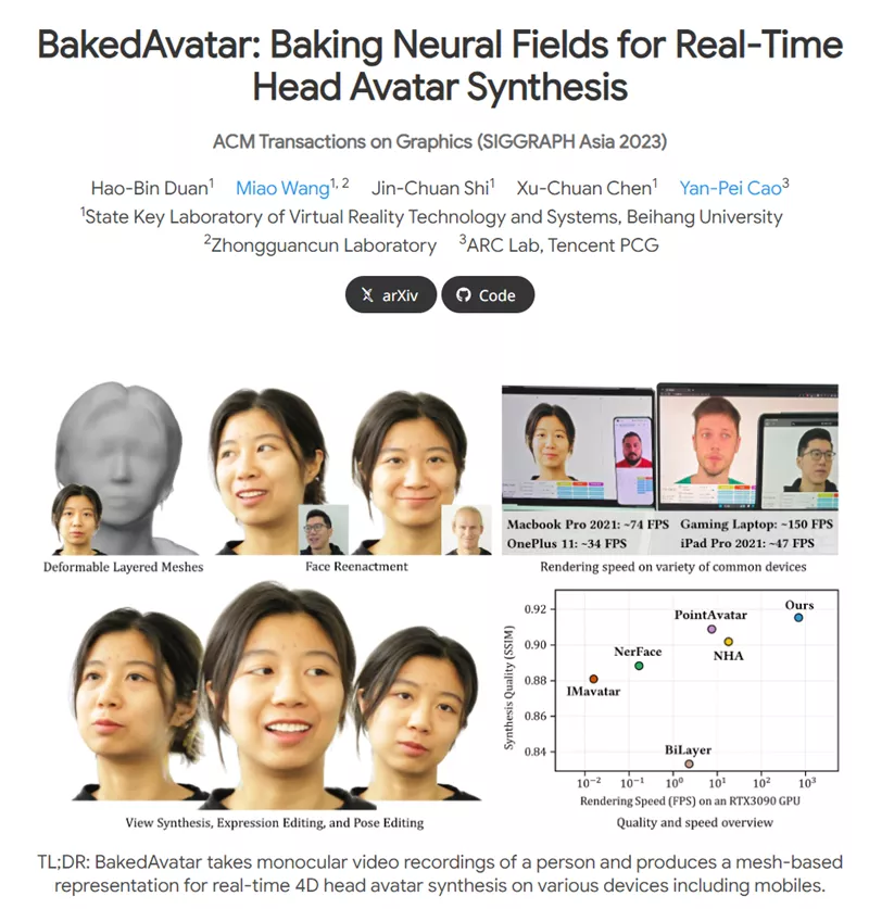 中国北航大学的虚拟现实技术与系统国家重点实验室以及腾讯 ARC 实验室合作开发的 BakedAvatar,用于从视频合成具有个性化特征的实时 4D 头部头像。只需要一个简短的视频,BakedAvatar 就能从这个视频中复制出该人物 3D 头部模型。同时精确捕捉其面部特征,模拟表情和头部运动,它还能对 3D 头部进行实时渲染,编辑和调整头像的表情、姿势等。简单来说,BakedAvatar 提供了一个高度灵活和互动的工具,用于创建和操作逼真的虚拟头像。