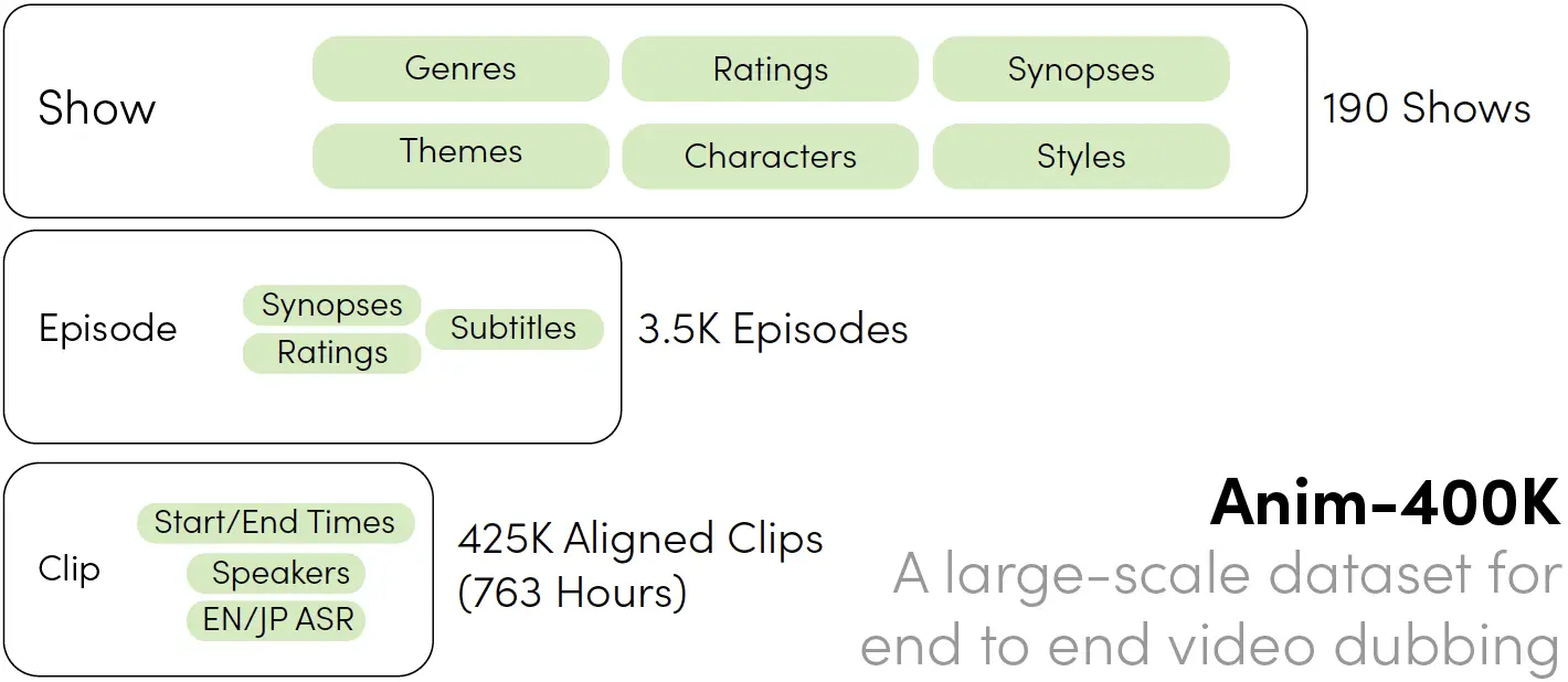 Anim400K 是一个大规模的数据集,包含英语和日语语言的对齐音频和视频剪辑。它由超过 425,000 个对齐的剪辑(共 763 小时)组成,包括来自 190 多个作品的视频和音频,涵盖了数百个主题和类型。Anim400K 还通过元数据进行了扩充,包括流派、主题、节目评级、角色概况和作品水平的动画风格,以及集数摘要、评级和字幕等。此外,还提供了基于对齐剪辑的预先计算的自动语音识别(ASR),以便进行深入研究多种音视频任务。