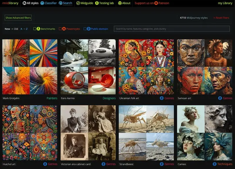 midlibrary 是一个收集了 4000 多种 Midjourney 艺术风格的图书馆。